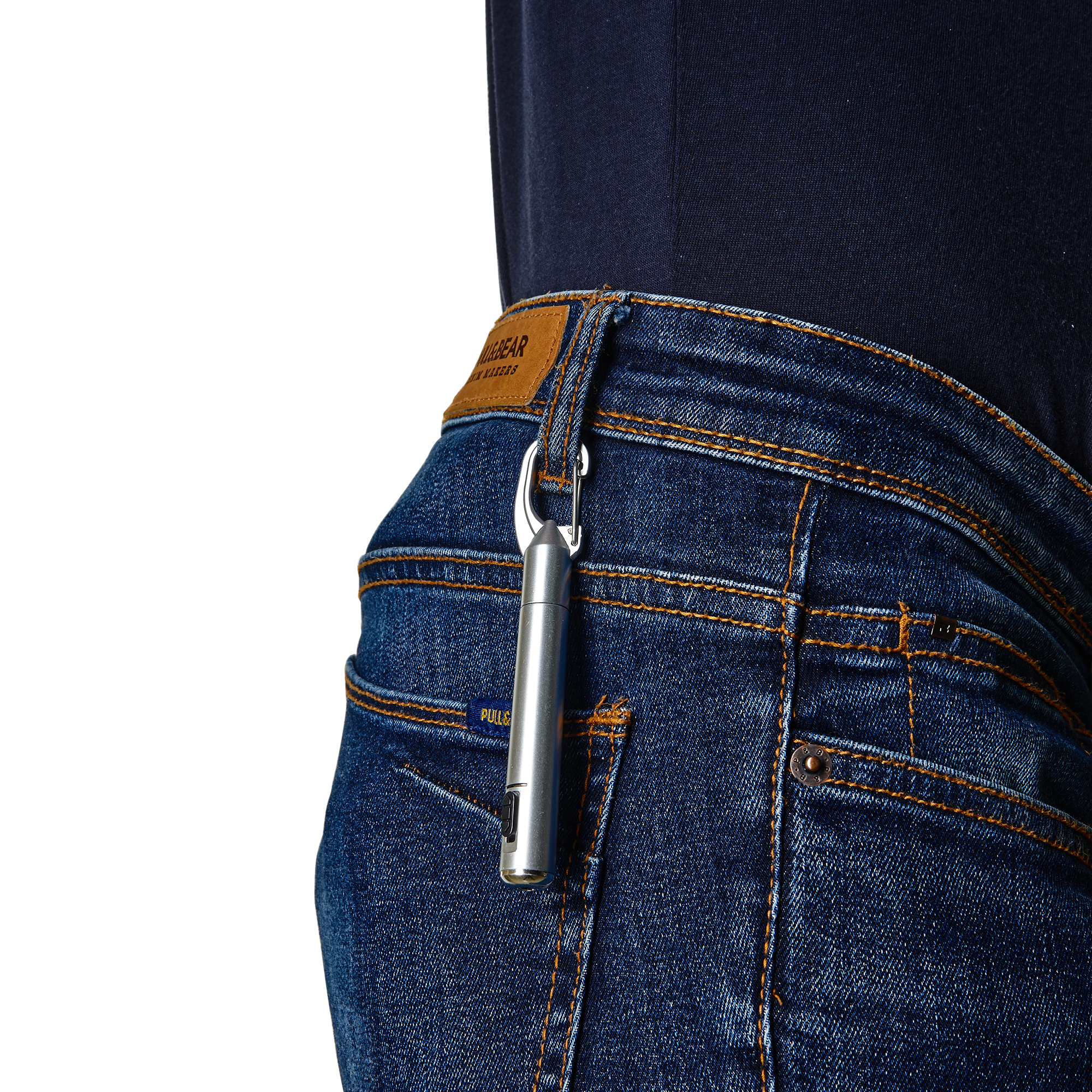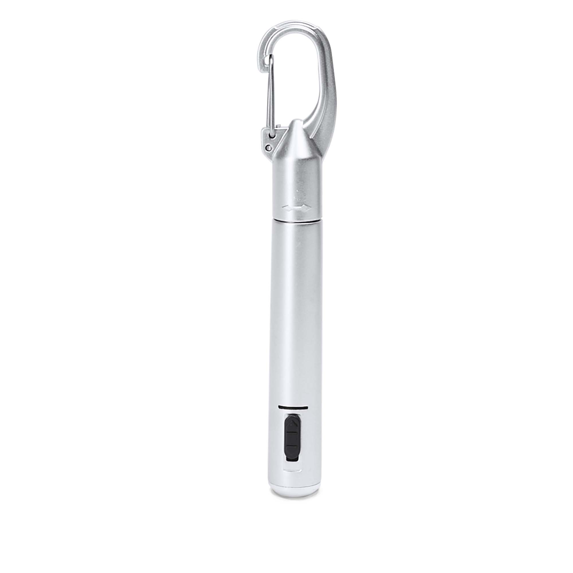 Bolígrafo con linterna de luz LED, disponible en varios colores con acabado metalizado y botón en negro. Mosquetón integrado en la capucha. Carga de tinta azul.