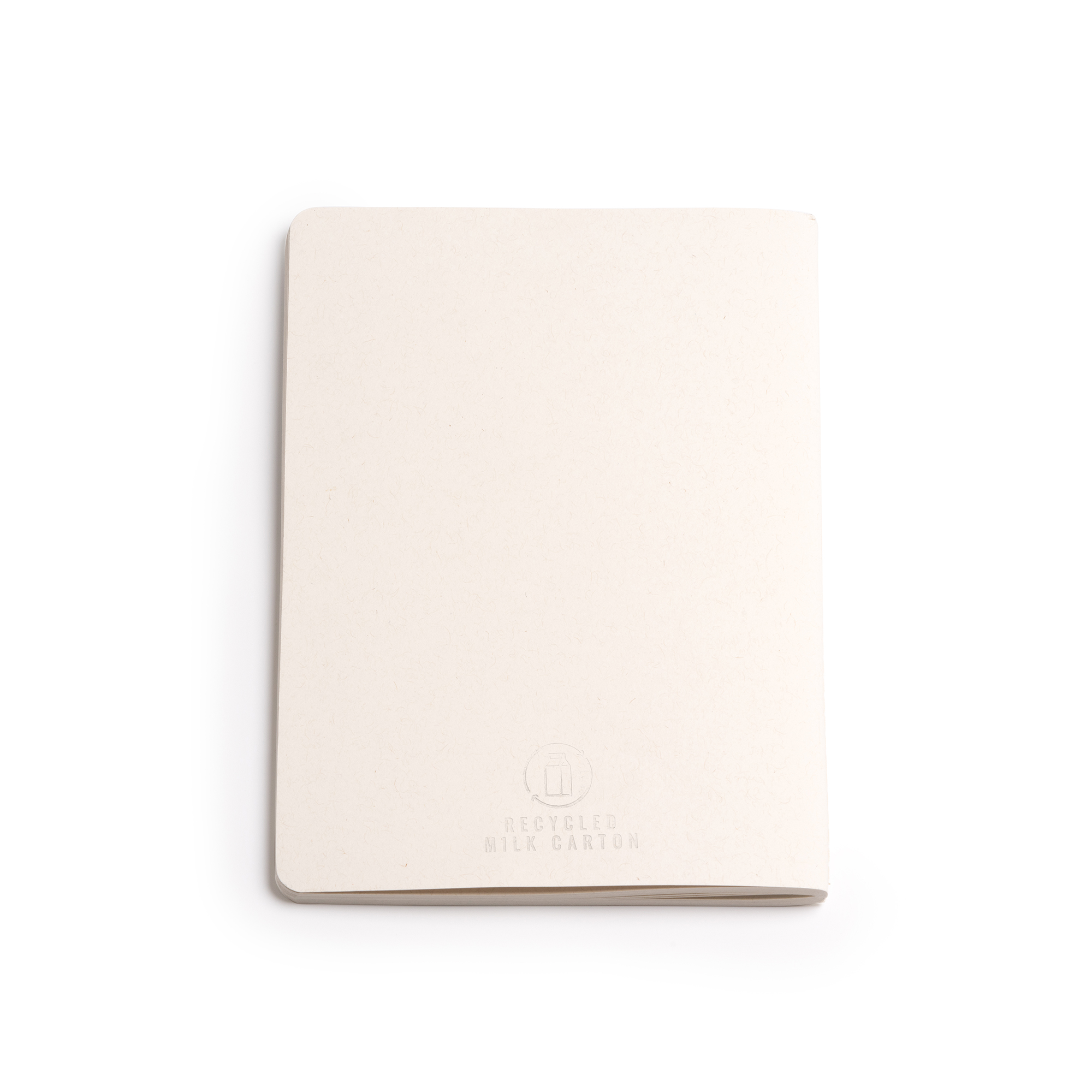 Bloc de notas A5 realizado en cartón reciclado de briks de leche. Tapa blanda. 100 hojas a rayas.