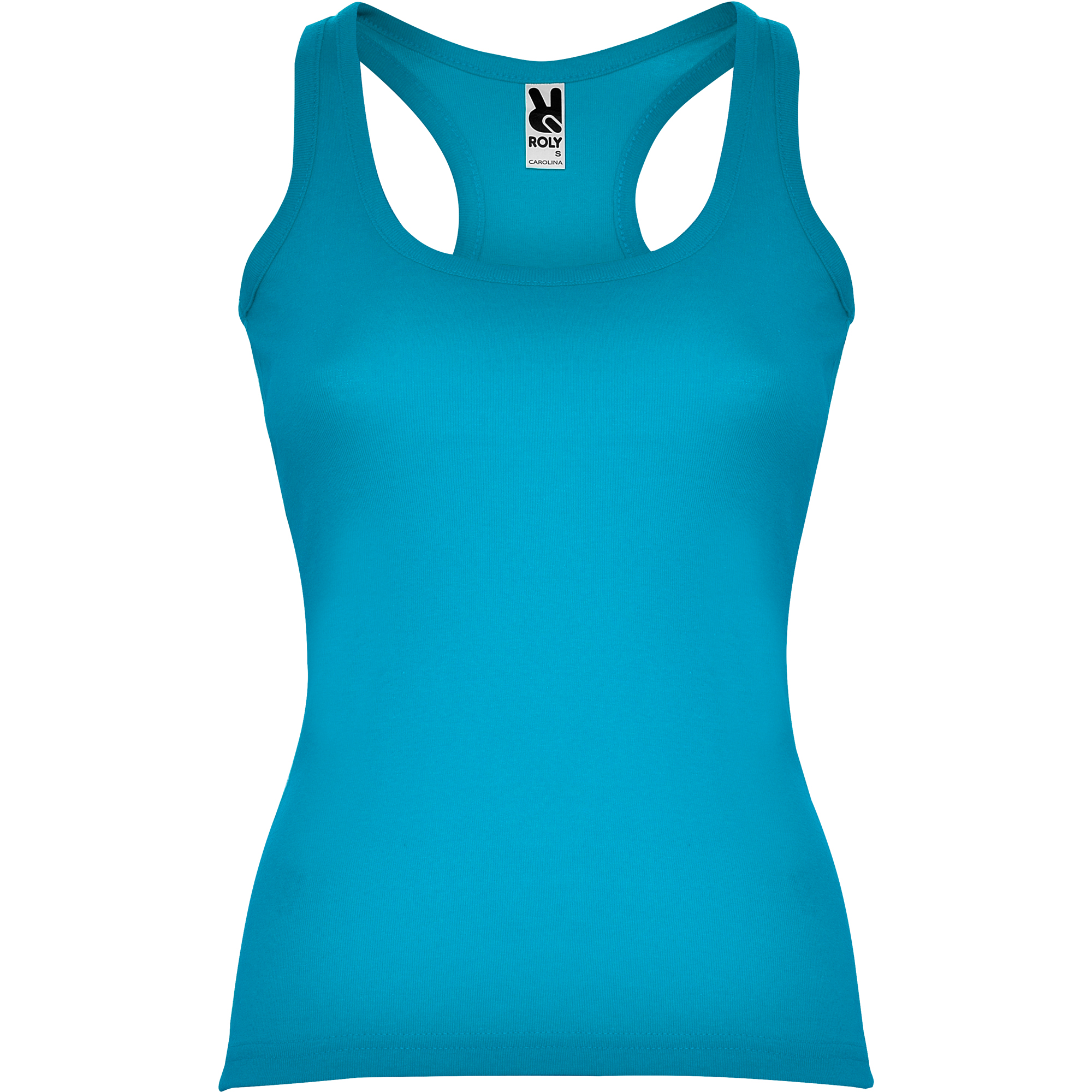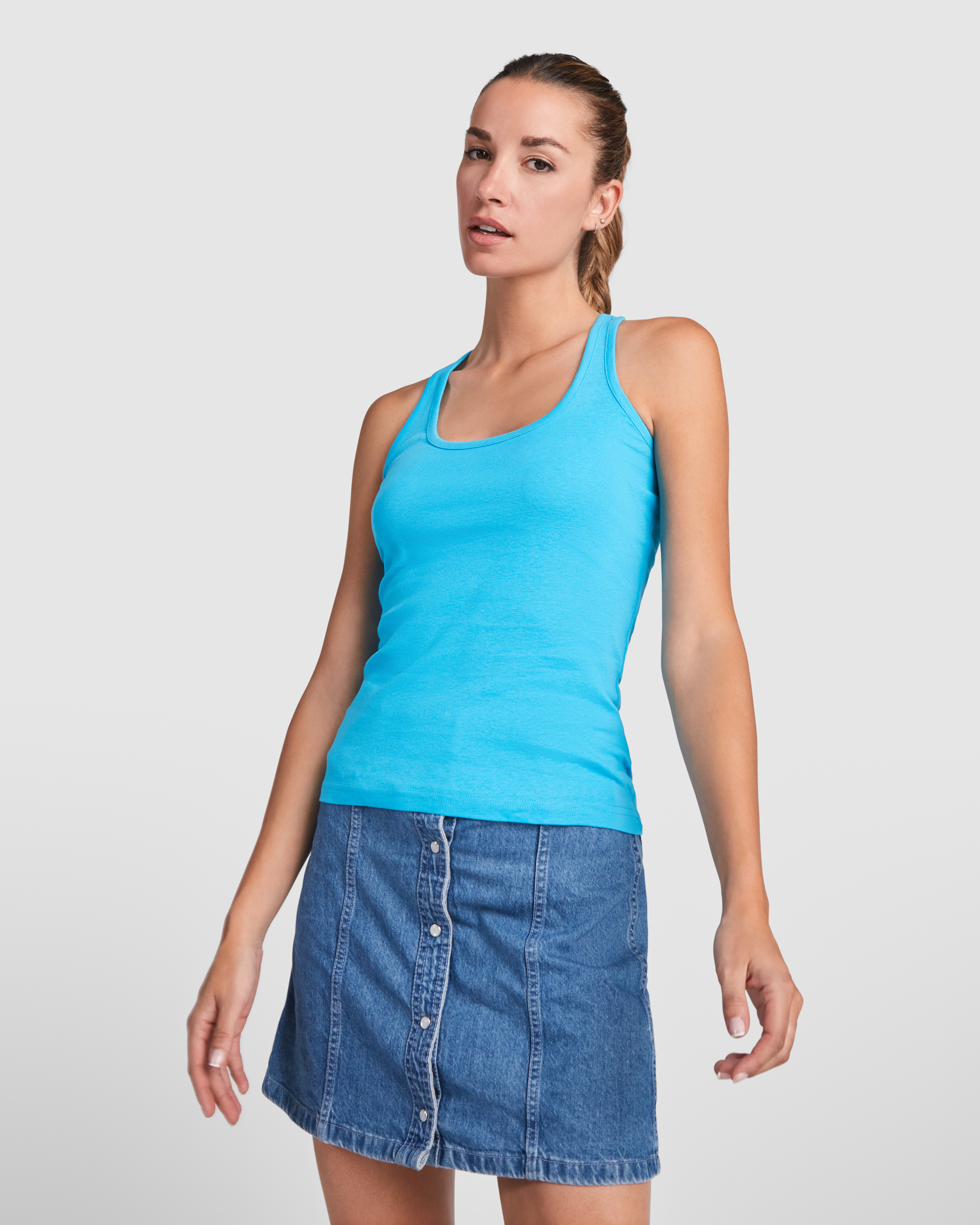 Camiseta entallada, con sisas y escote ribeteado, ancho y enrollado. Espalda estilo nadadora y costuras laterales.