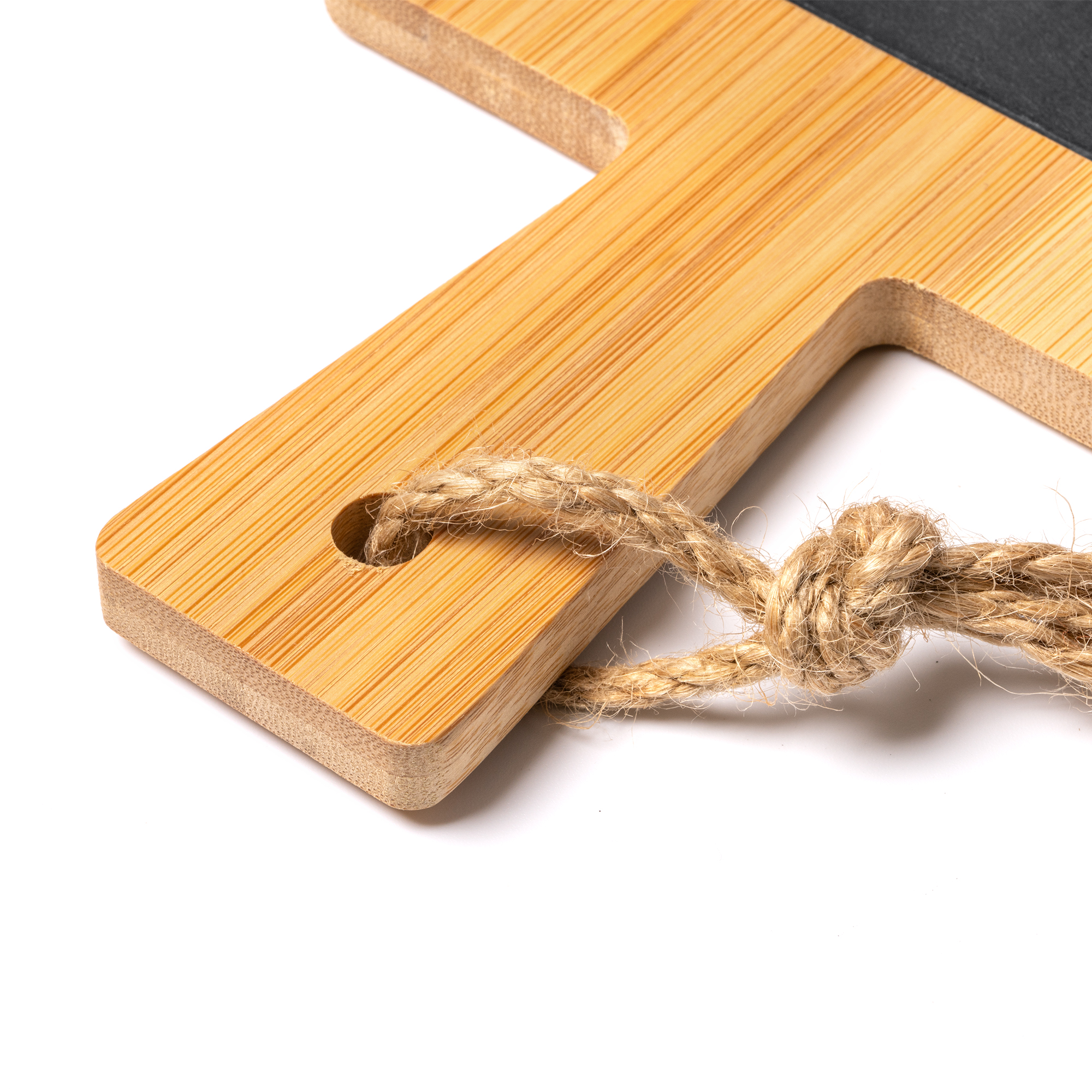La tabla de cortar de bambú y pizarra es una herramienta versátil y funcional para la cocina. Su diseño combina la belleza y durabilidad del bambú con la practicidad de la pizarra, ofreciendo un utensilio ideal para cortar y presentar alimentos.