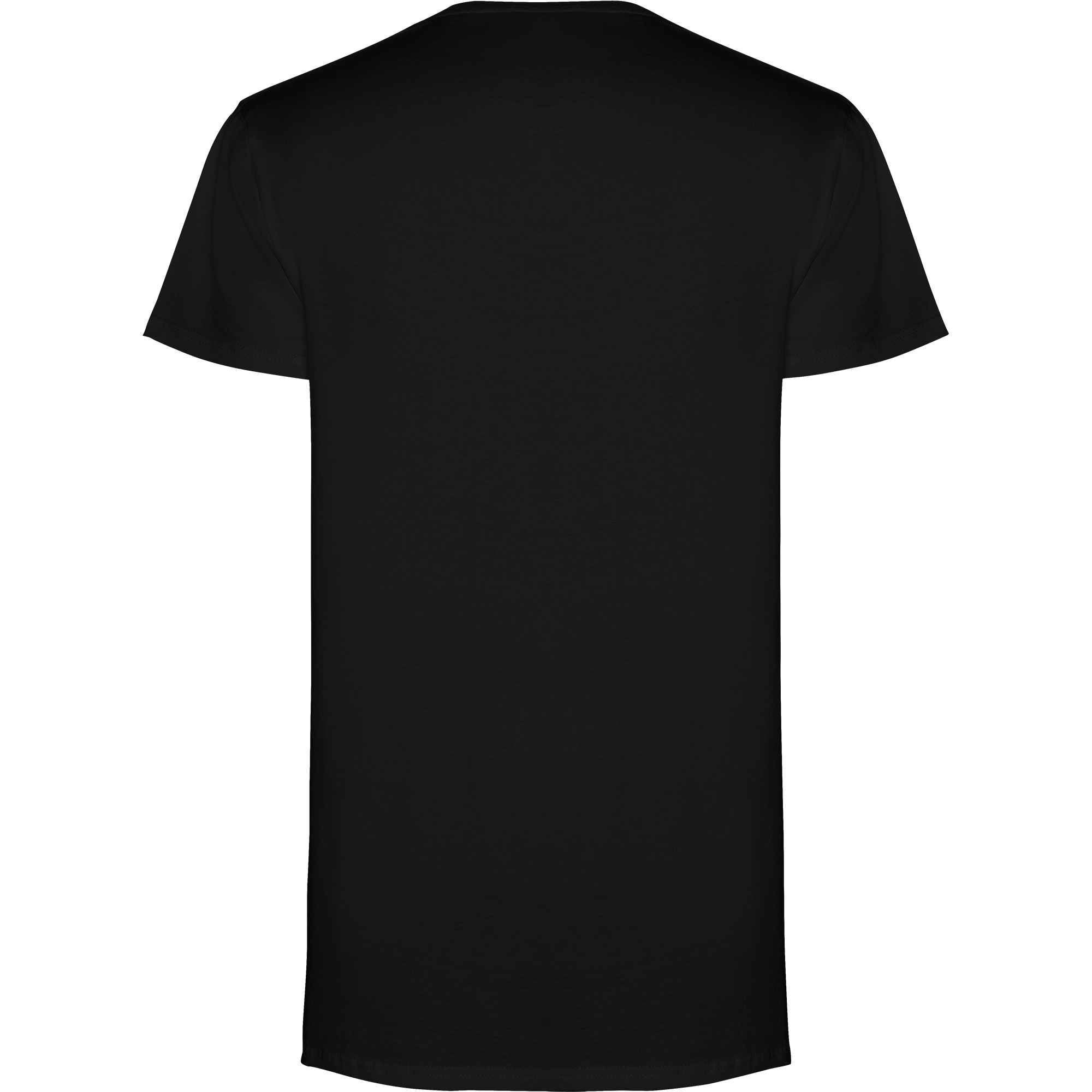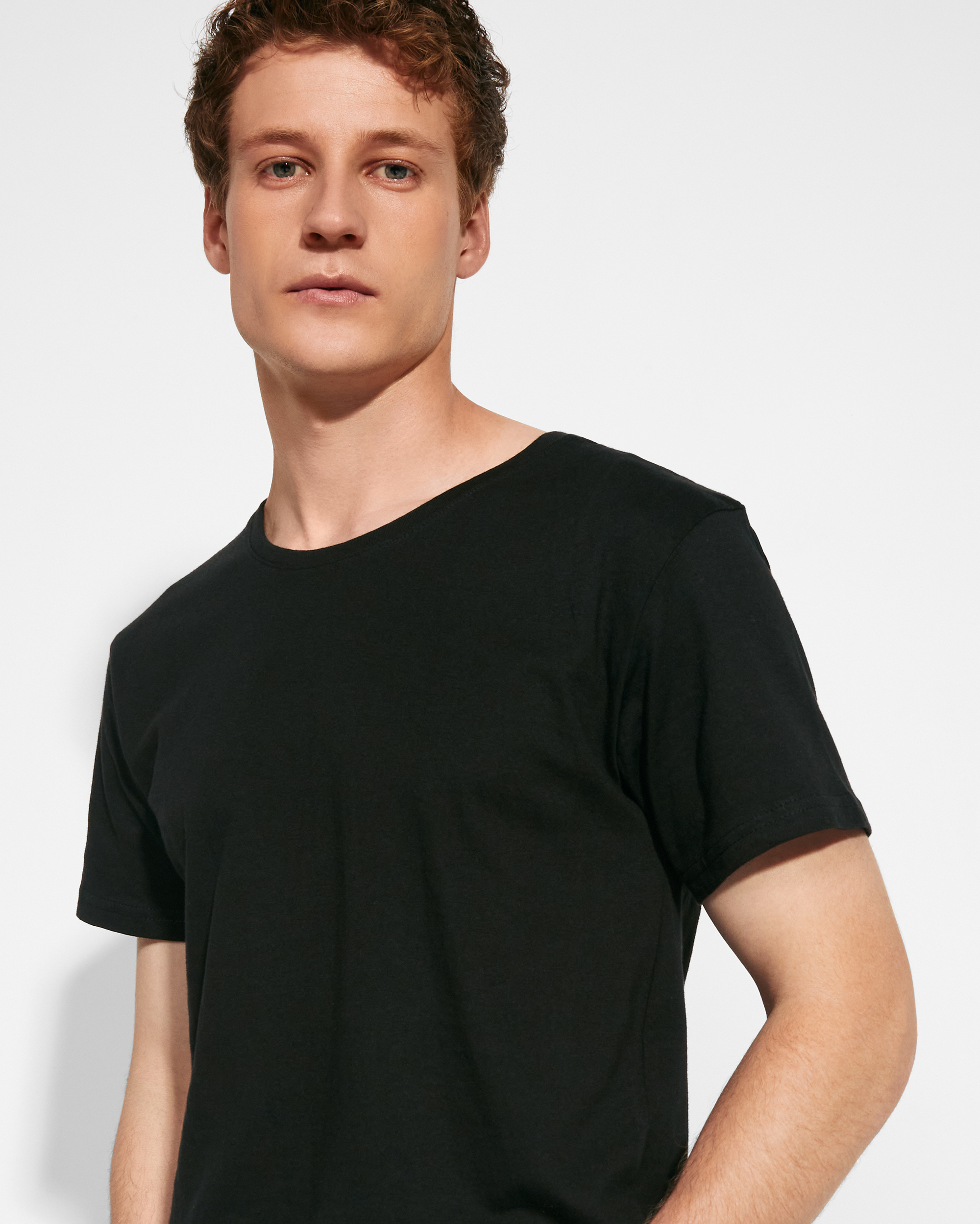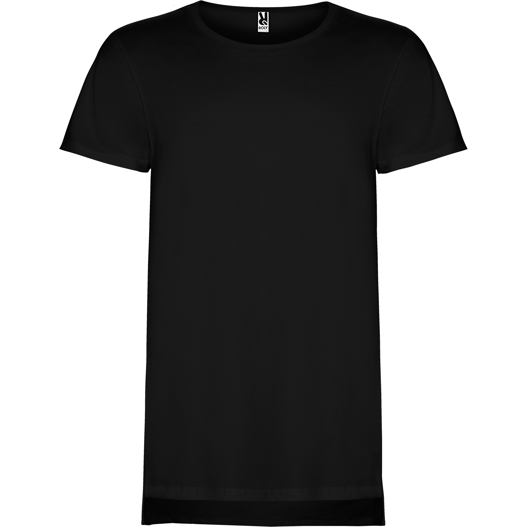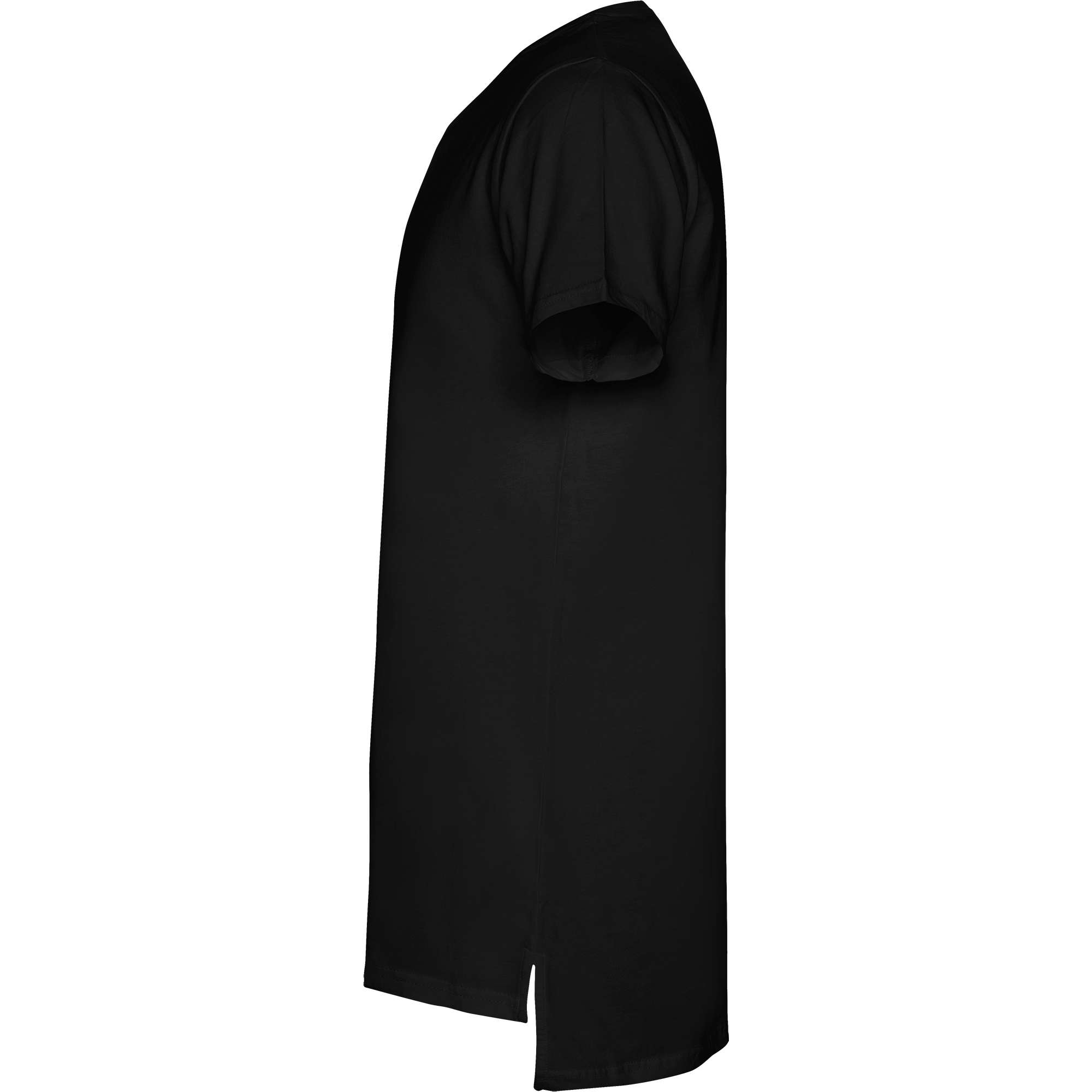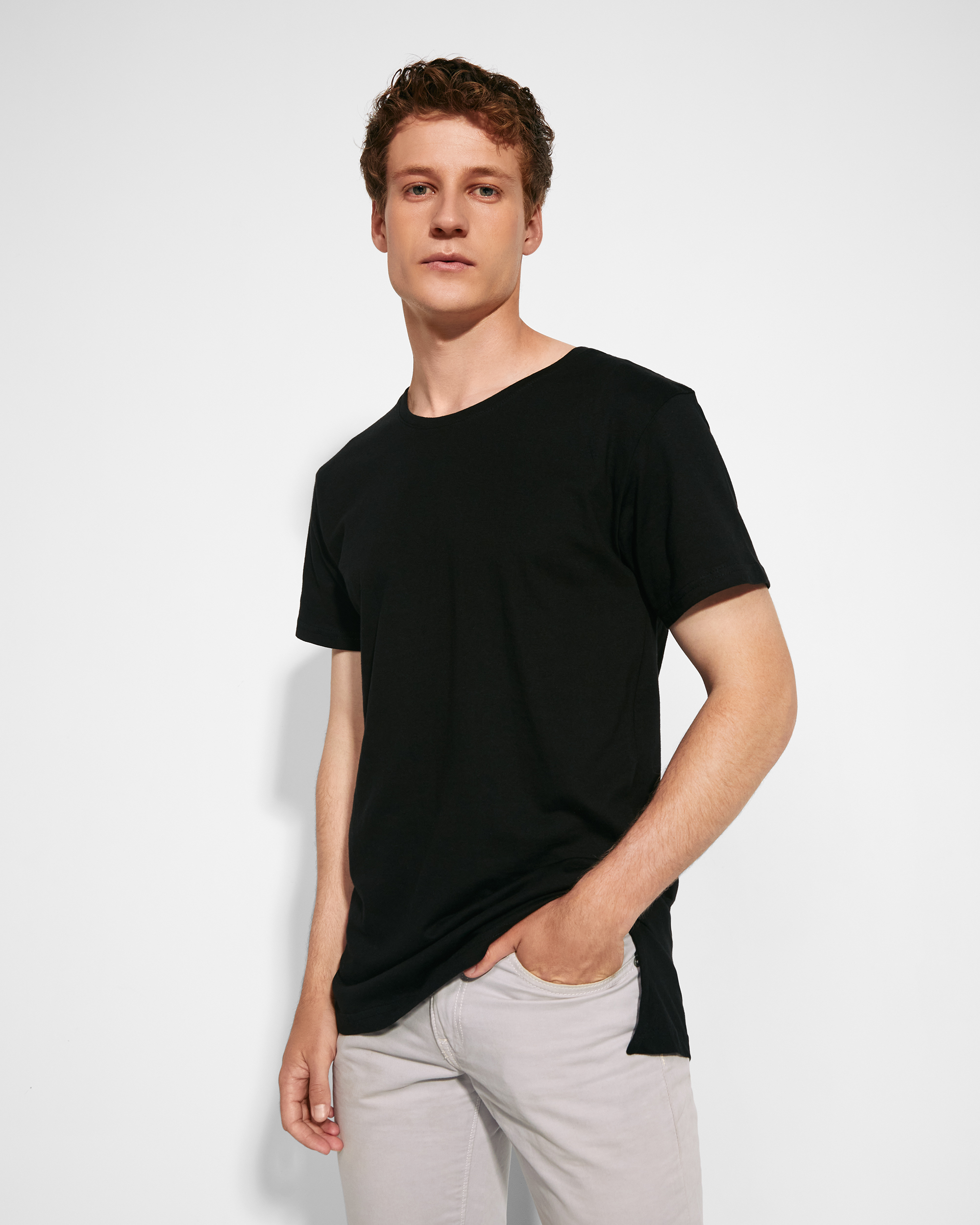 Camiseta de manga corta y talle extra largo, con cuello redondo de dos capas con elastano. Aperturas laterales en el bajo. El patronaje de la espalda es ligeramente más largo que el delantero.