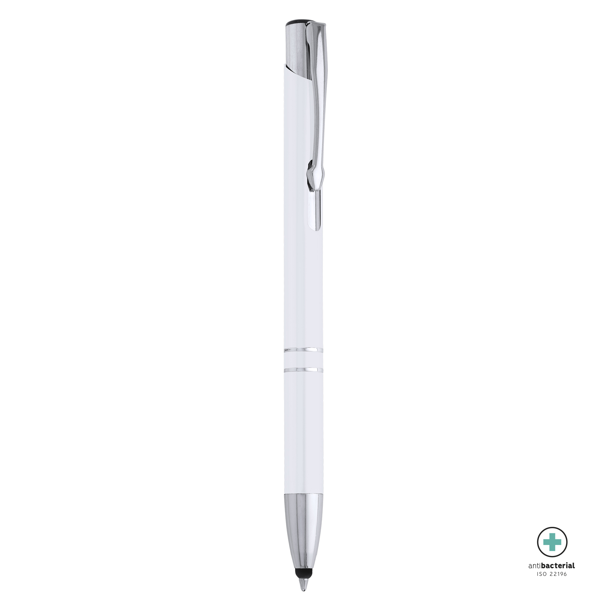 Bolígrafo con puntero táctil, cuerpo anti-bacterias y clip metálico. Previene e inhibe el crecimiento de bacterias sobre el cuerpo del bolígrafo. Carga de tinta azul de 1 mm.