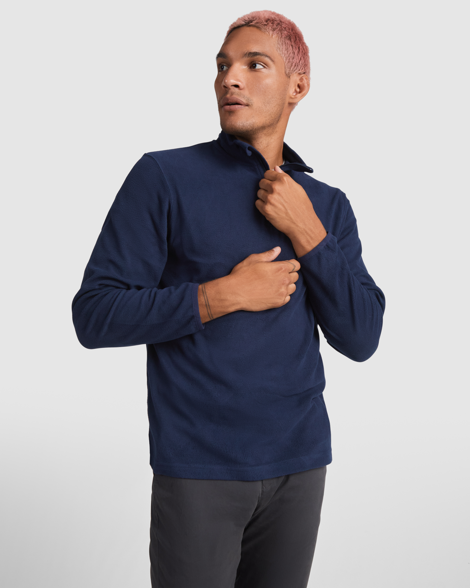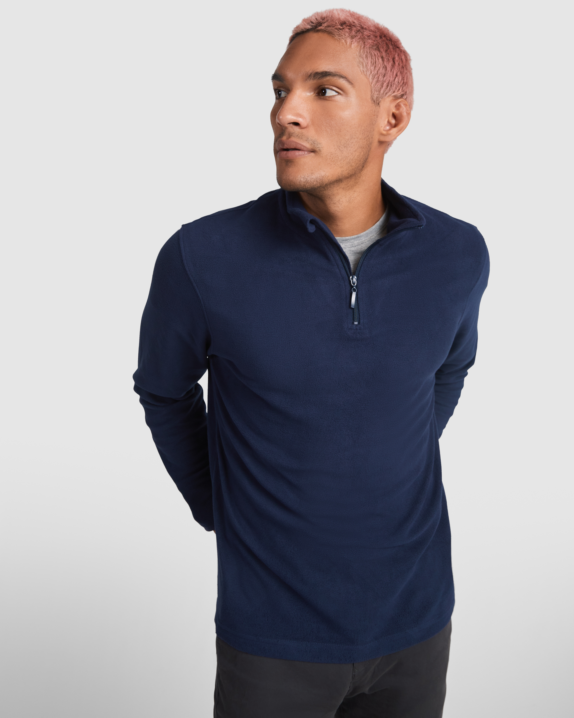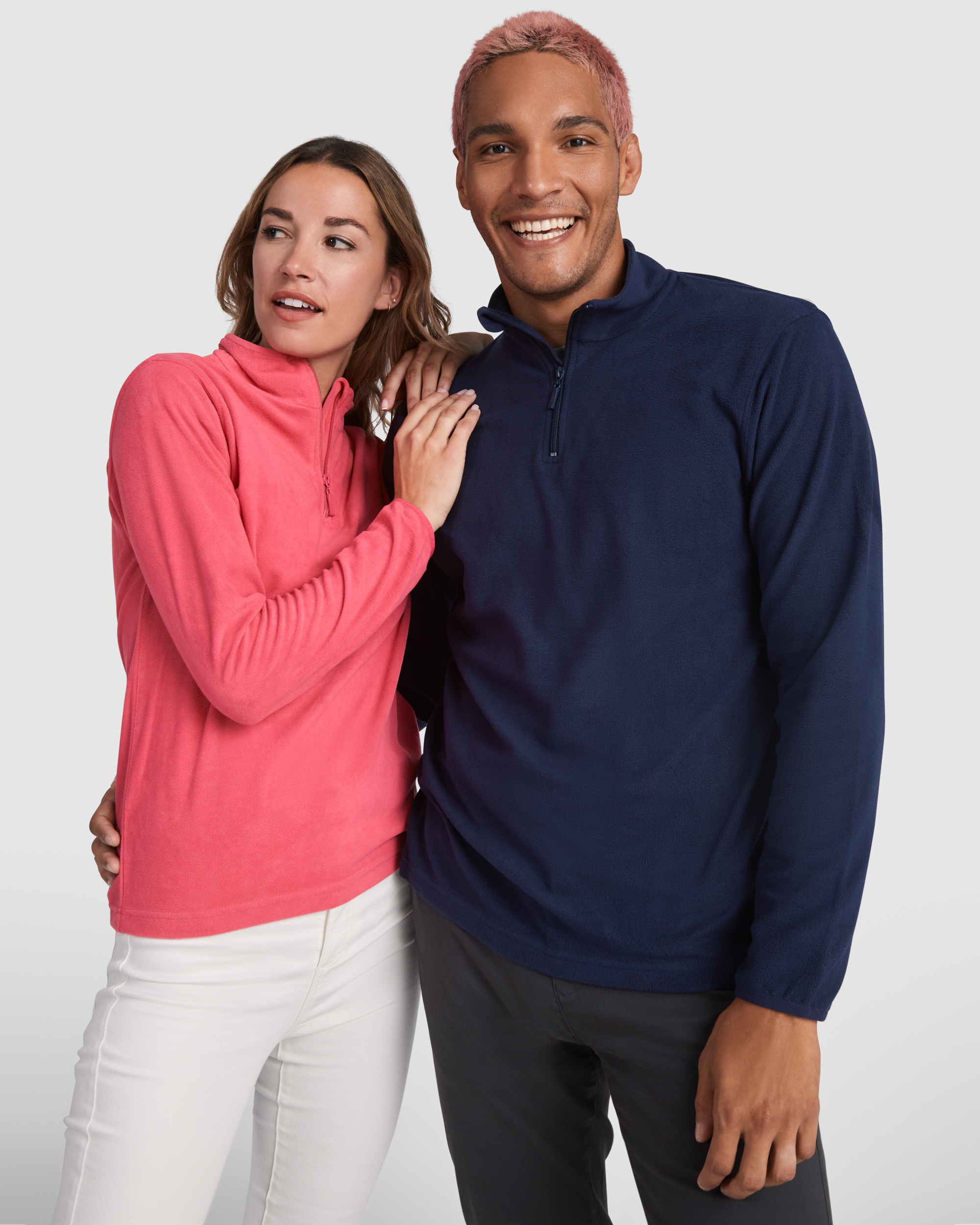 Micropolar con media cremallera en cuello y protector de barbilla. Puños con ribete elástico a tono.