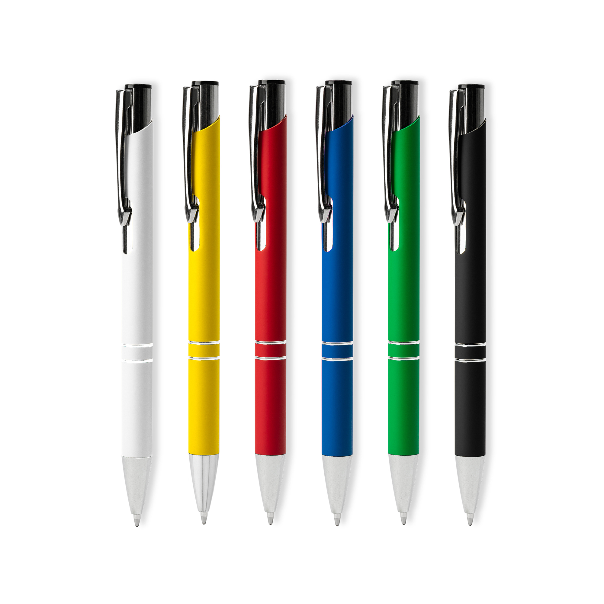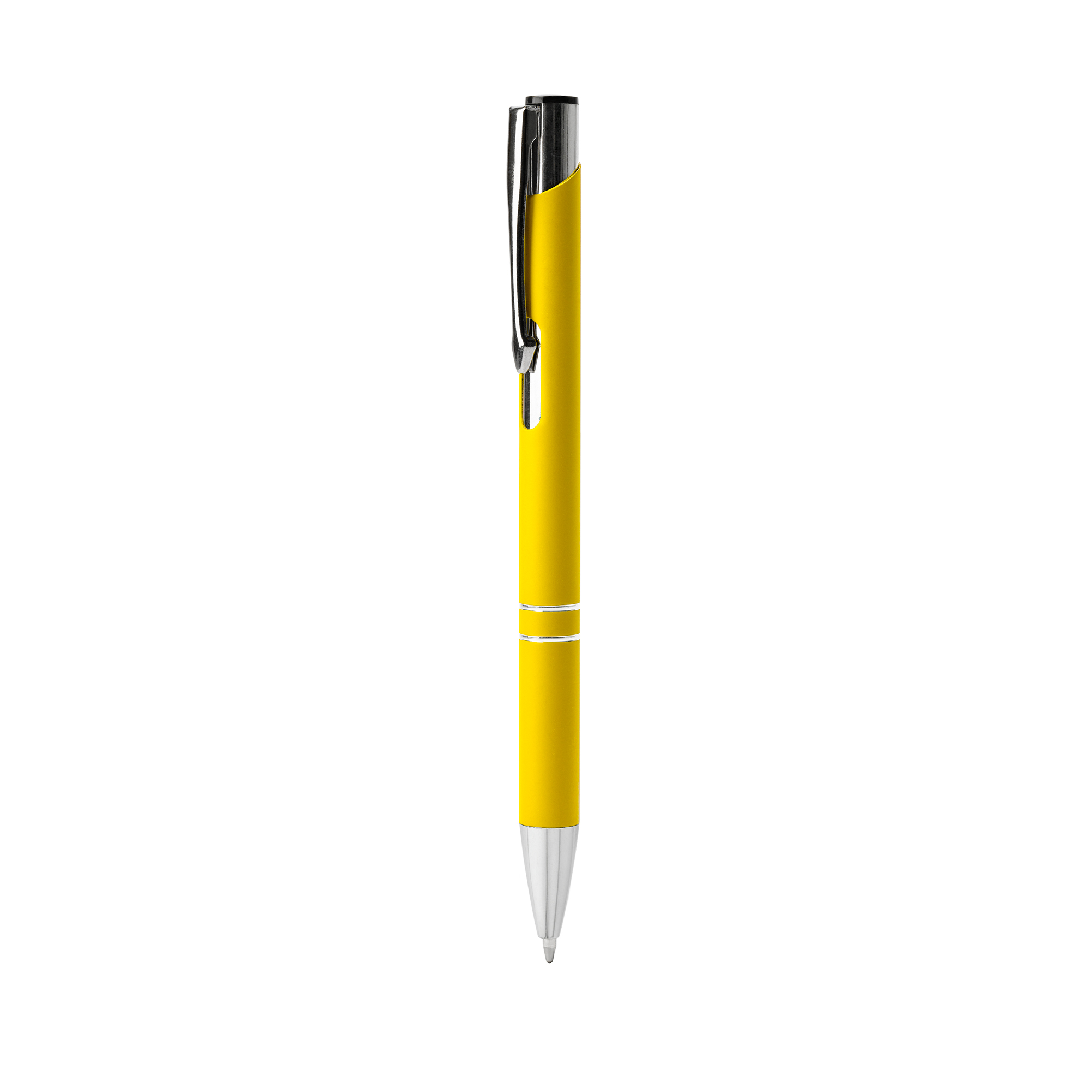 Bolígrafo con cuerpo metálico de tacto suave y pulsador en acabado anodizado. Punta, clip y detalles en metal cromado.