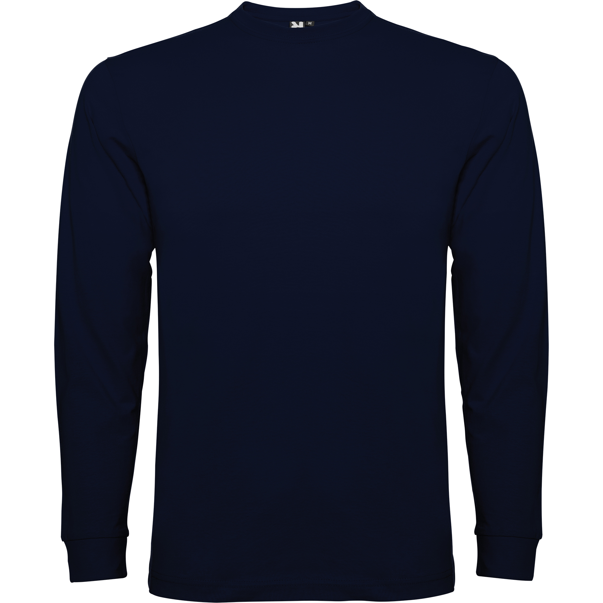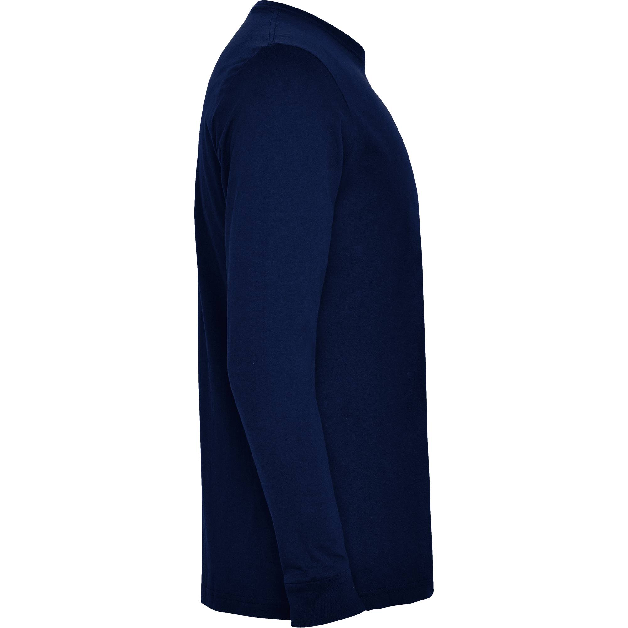 Camiseta de manga larga, costuras laterales, con cuello redondo de 4 capas y puños canalé 1×1. Cubre costuras reforzado en cuello y hombros.