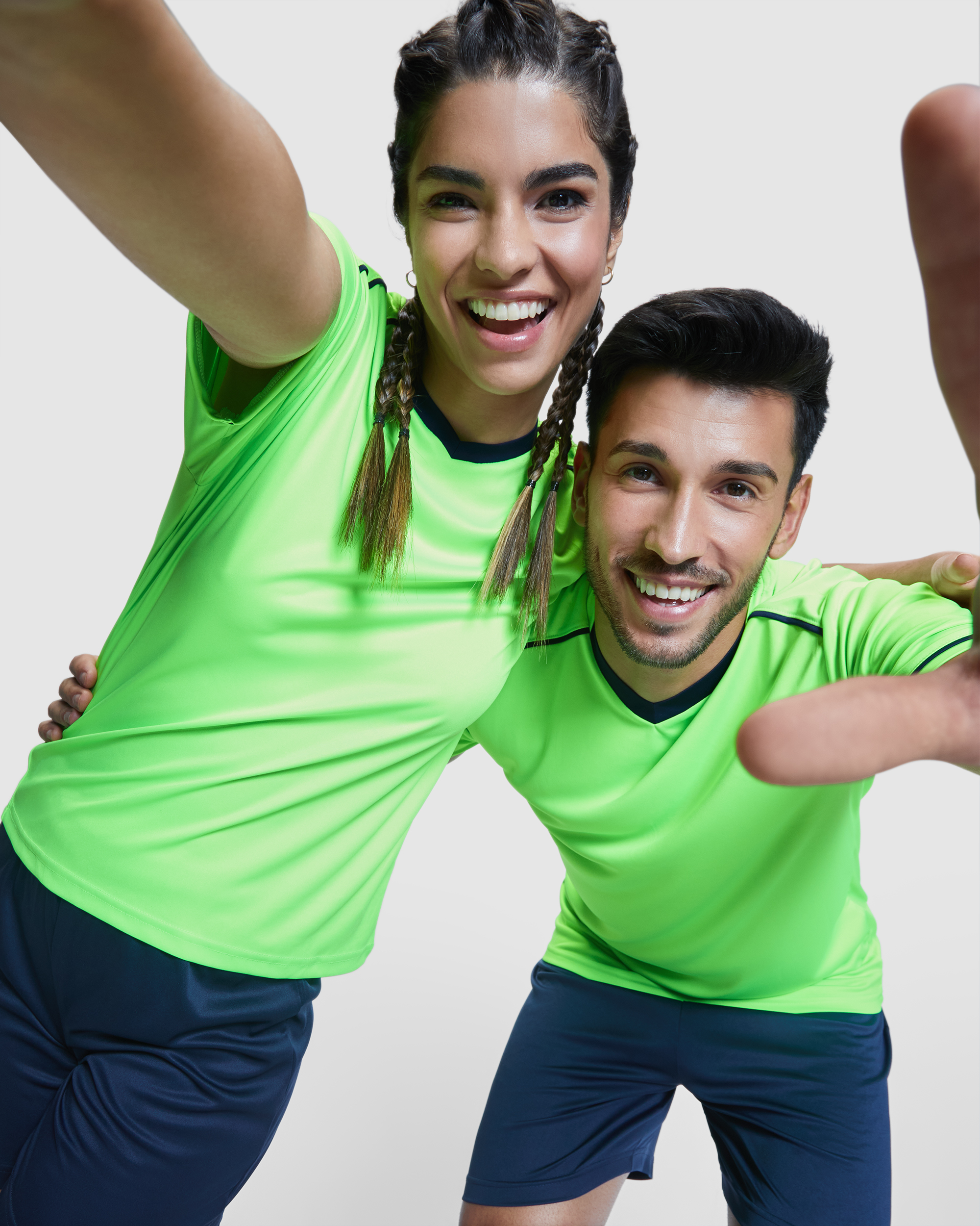 ·Camiseta con doble cuello de fantasía con acabado en pico con cubrecosturas reforzado en el interior.