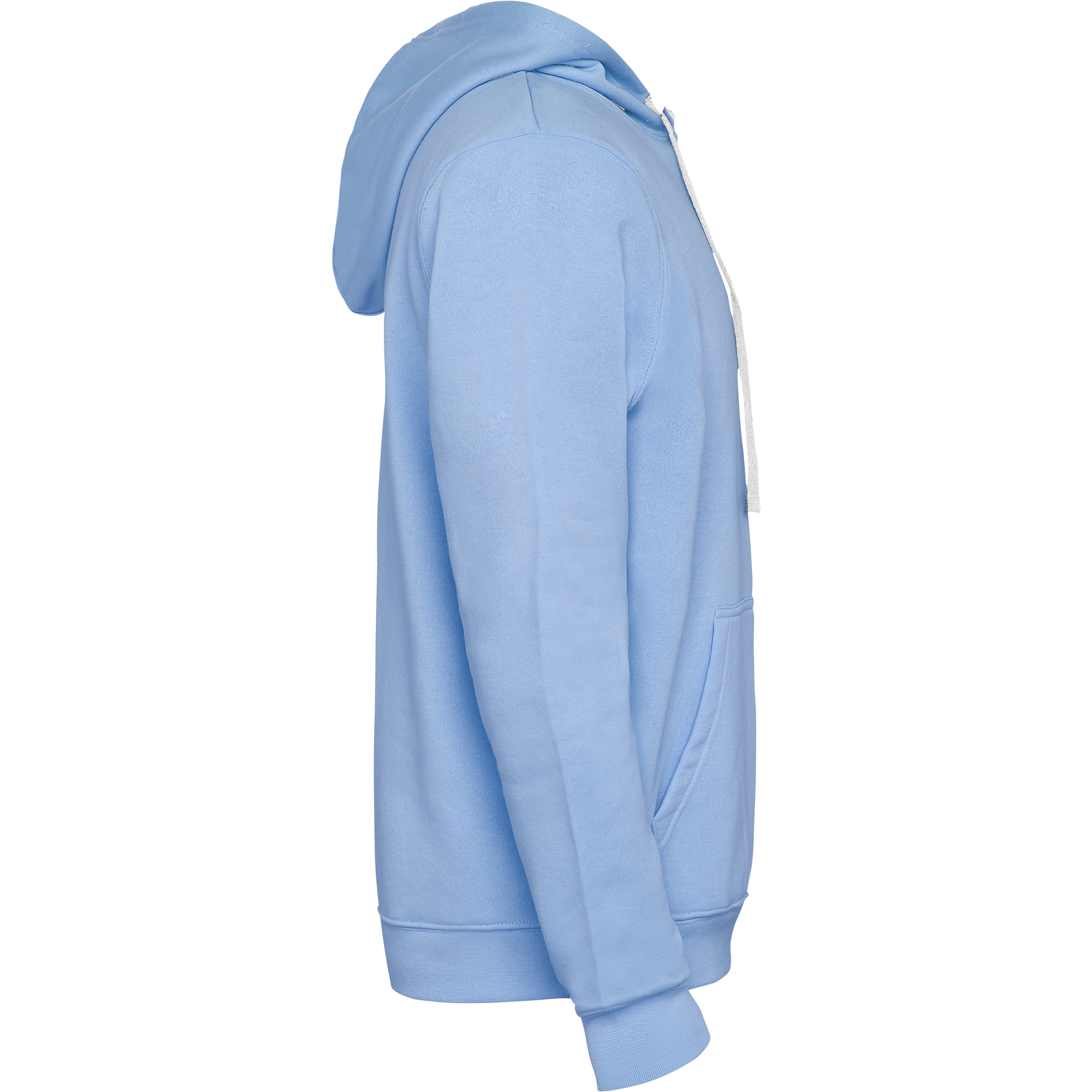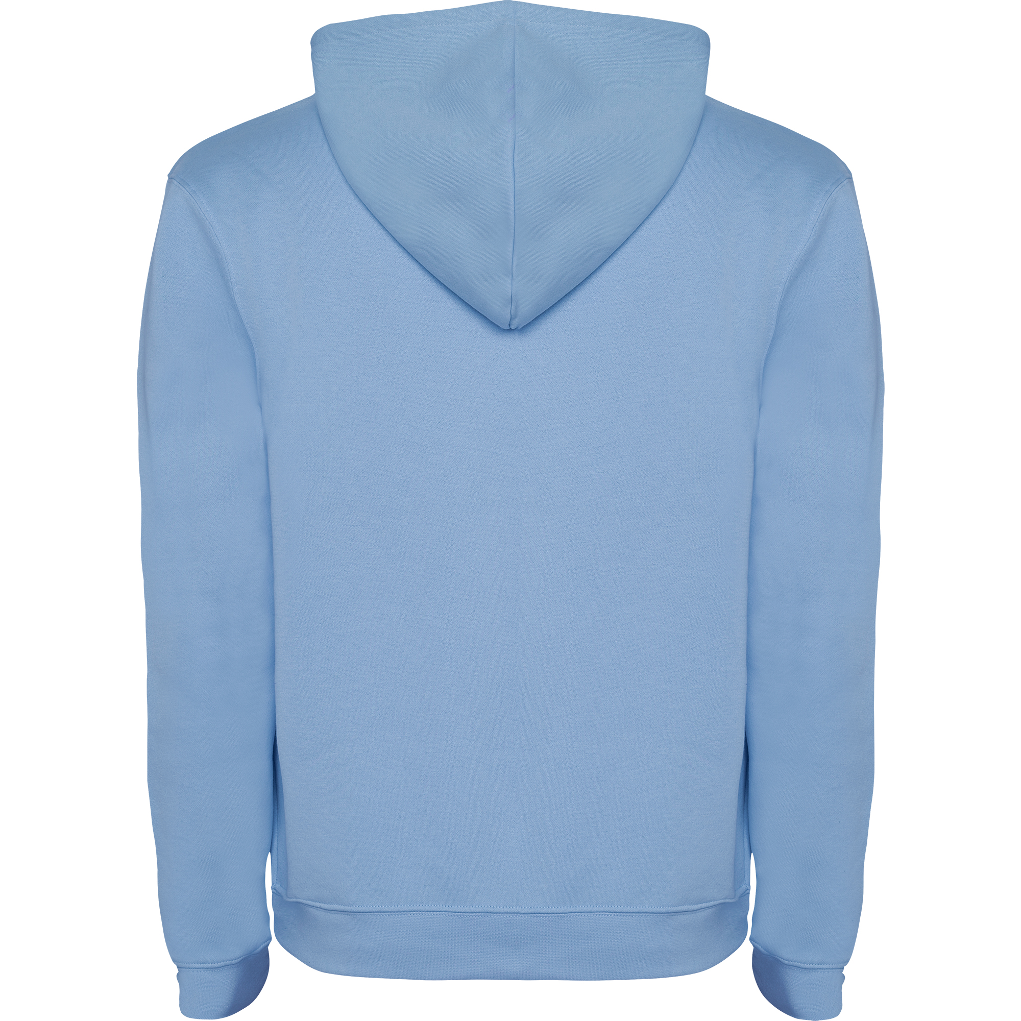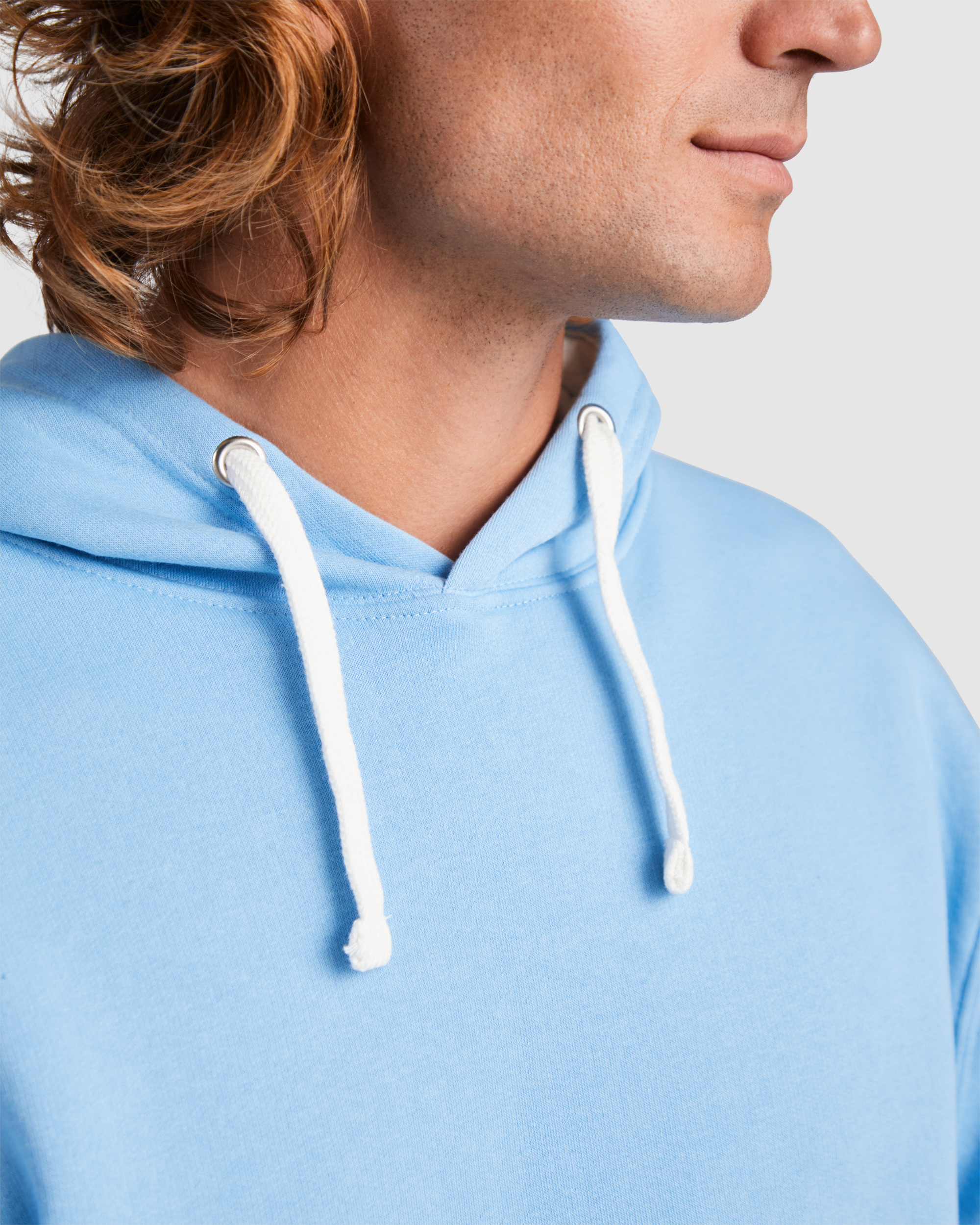 Sudadera con capucha de doble tejido, con cordón ajustable, en acabados solido y bicolor. Cubrecosturas en el cuello y bolsillo canguro. Punto canalé con elastano 1×1 en puños y cintura. Modelo de niño sin cordón.
