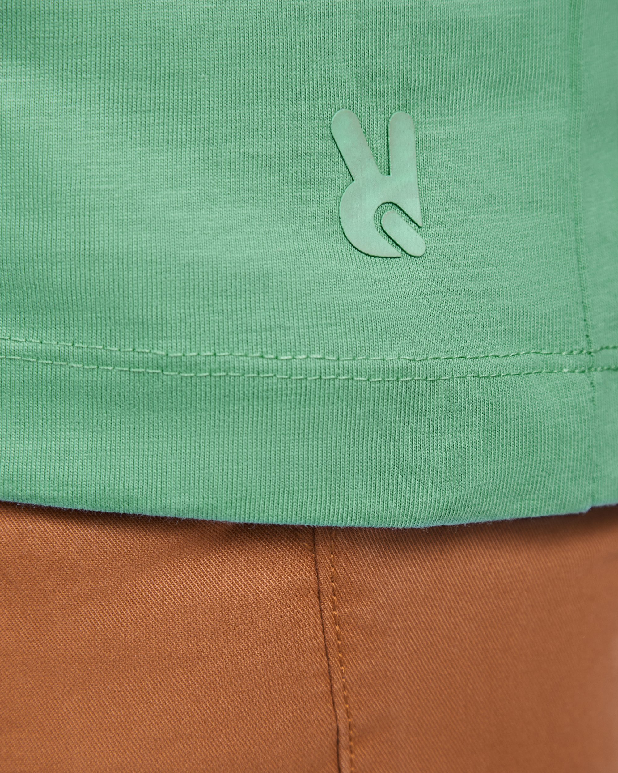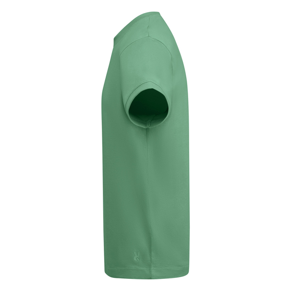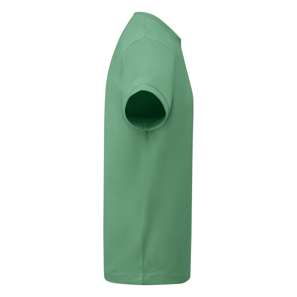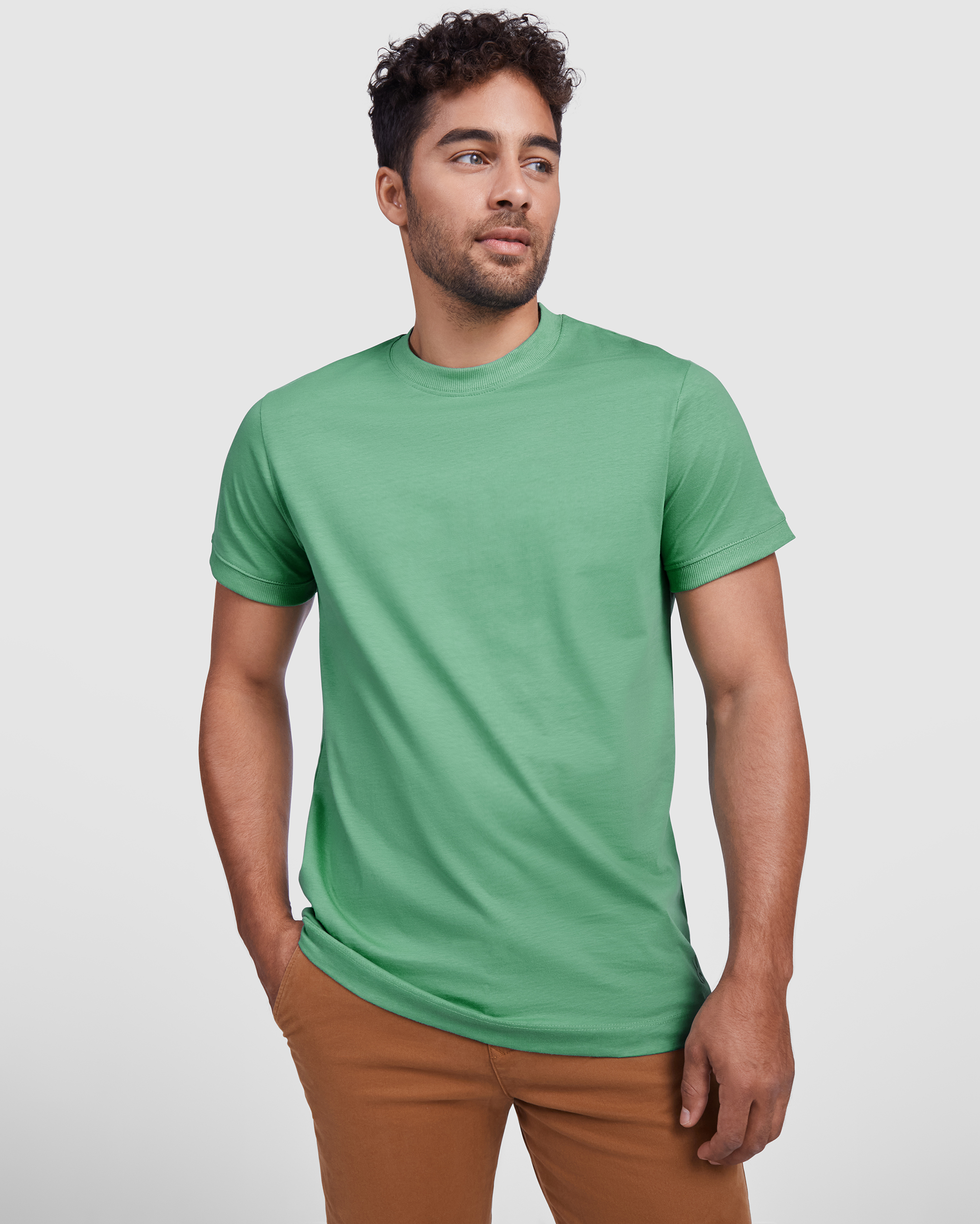 Camiseta gruesa de hombre en manga corta de algodón . Cuello redondo y ribete mangas en canalé ancho 2×1. Cubrecosturas reforzado en cuello. Costuras laterales. Logo Roly a tono en bajo lateral izquierdo. Costura ancha en el bajo.